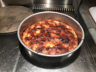 350 degree oven. Mix dry ingredients. Whip eggs and sugar until ribbon off the fork, whisk in flour a little at a time, fold in apples until all are coated. It'll look like all apple, which is as it should. See photo. Spoon or pour into cake pan, spring pan if you have, I think mine was 9". Smooth so no bubbles. Sprinkle 1 tbsp sugar on top. I'm at 3,600 feet so 45 min as recipe called for didn't quite do it. I then turned the oven to 425 for a few minutes until browned as you see. Serve with whipped cream, creme fraich if you want true French, or ice cream. Try to hide a piece for breakfast. If you hit it just right, the apples remain a little crisp.